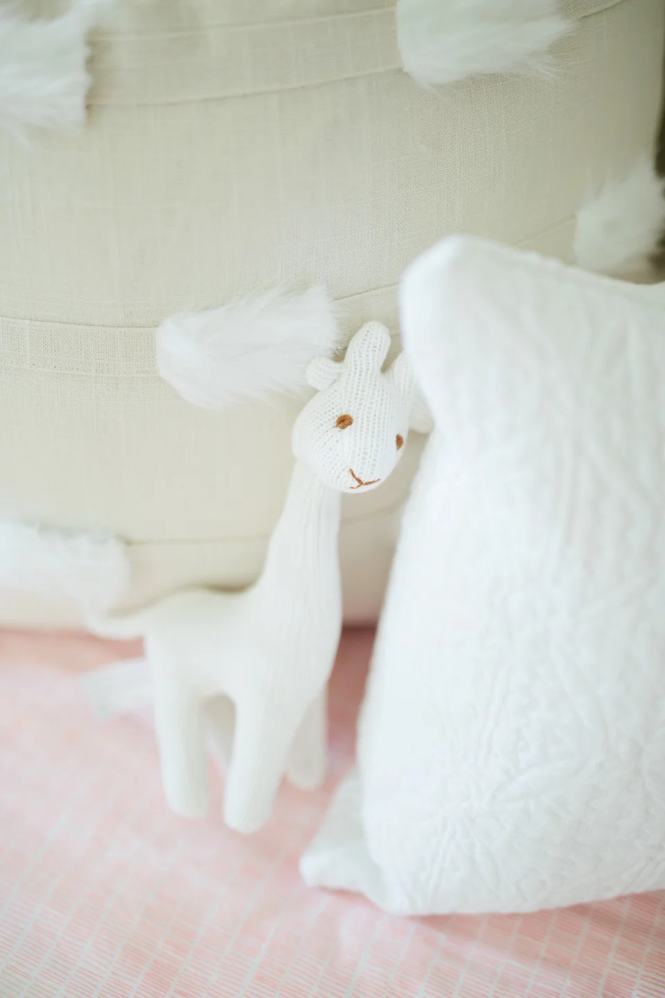 For some reason, the crib sheet was the hardest to find. We knew we were looking for a blush pink, but definitely wanted something that would play nicely with the rest of the textures and textiles in the scene. This crib sheet from Dwell Studio finely popped up on my screen and we knew it was the one! The pillows were also custom made from some of our favorite materials.